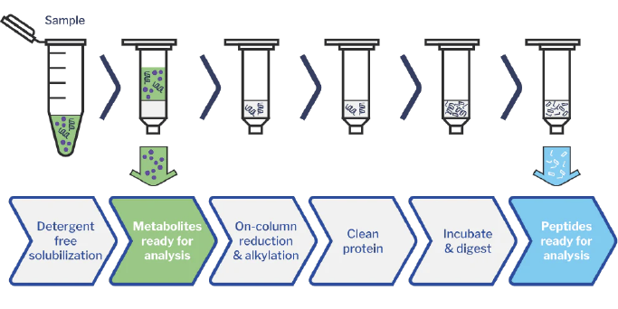 The flow-through is collected and contains small molecule metabolites and lipids compatible with direct mass spectrometry analysis. Trapped proteins are further denatured, reduced, and alkylated in situ on column.