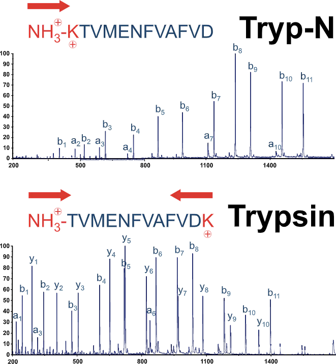 Tryp-N™ is a thermophilic metalloprotease with N-terminal specificity for arginine and lysine engineered at Cold Spring Harbor Laboratory (CSHL). Tryp-N™ provides clarified spectra and greater sensitivity by yielding peptides in which the basic centers of peptides – the amino terminus and side chains of K/R – are located together to produce b-ion dominated spectra. Tryp-N™ has been demonstrated to yield simplified MS/MS fragmentation and have the best proteolytic activity.¹ Tryp-N™ spectra provide the complimentary ion series to compliment trypsin, allowing you to more easily find and specifically localize PTMs. PTM identification and localization of PTMs, such as phosphorylation in YST clusters, and de novo sequencing. Additionally, as ion current remains on b-ions during fragmentation of MRM assays, rather than becoming diluted between two charged termini in tryptic peptides, sensitivity is often enhanced.