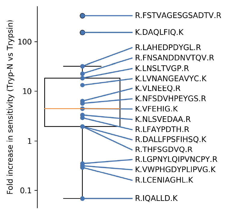 ¹Wilson JP, Ipsaro JJ, Del Giudice SN, Turna NS, Gauss CM, Dusenbury KH, Marquart K, Rivera KD, Pappin DJ. Tryp-N: A thermostable protease for the production of N-terminal argininyl and lysinyl peptides. Journal of Proteome Research. 2020 Mar 6;19(4):1459-69.